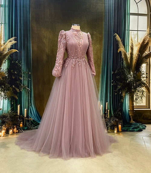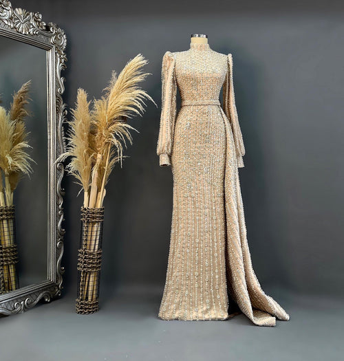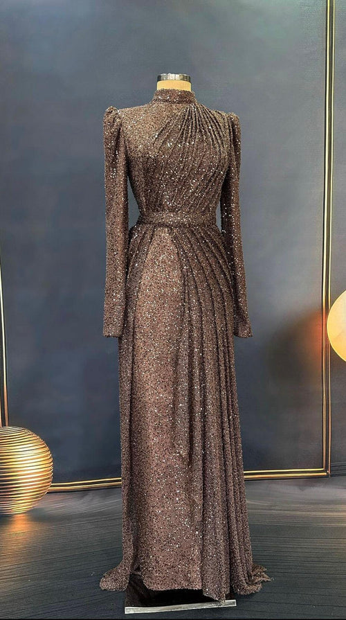 Bronze Color Sparkling Evening Dress Hijab Evening Dress Models Gray, Night Blue Color Evening Dress İslamic Evening Dresses